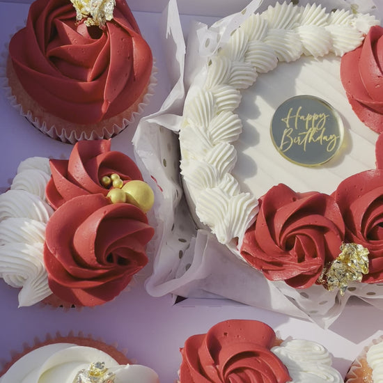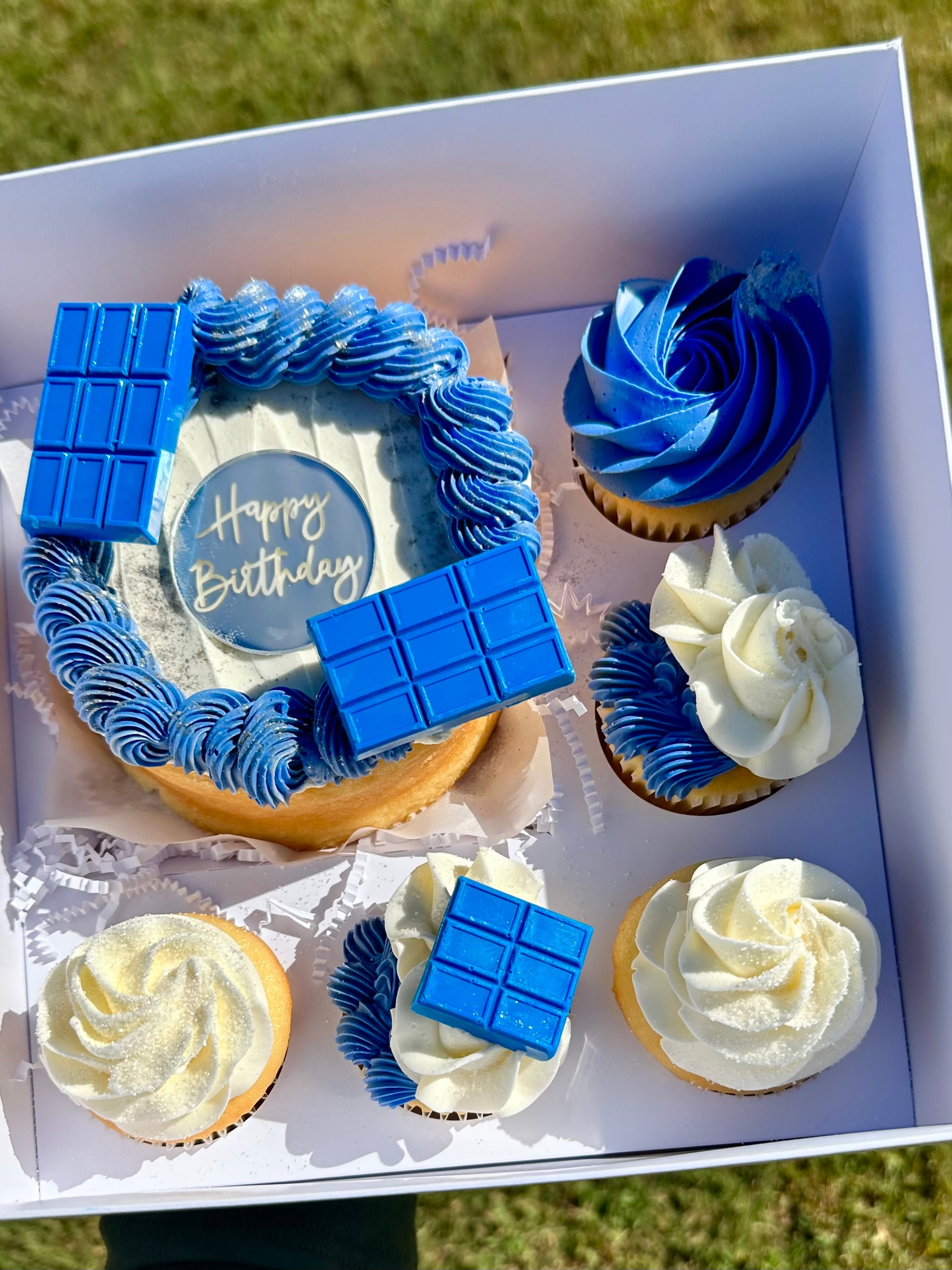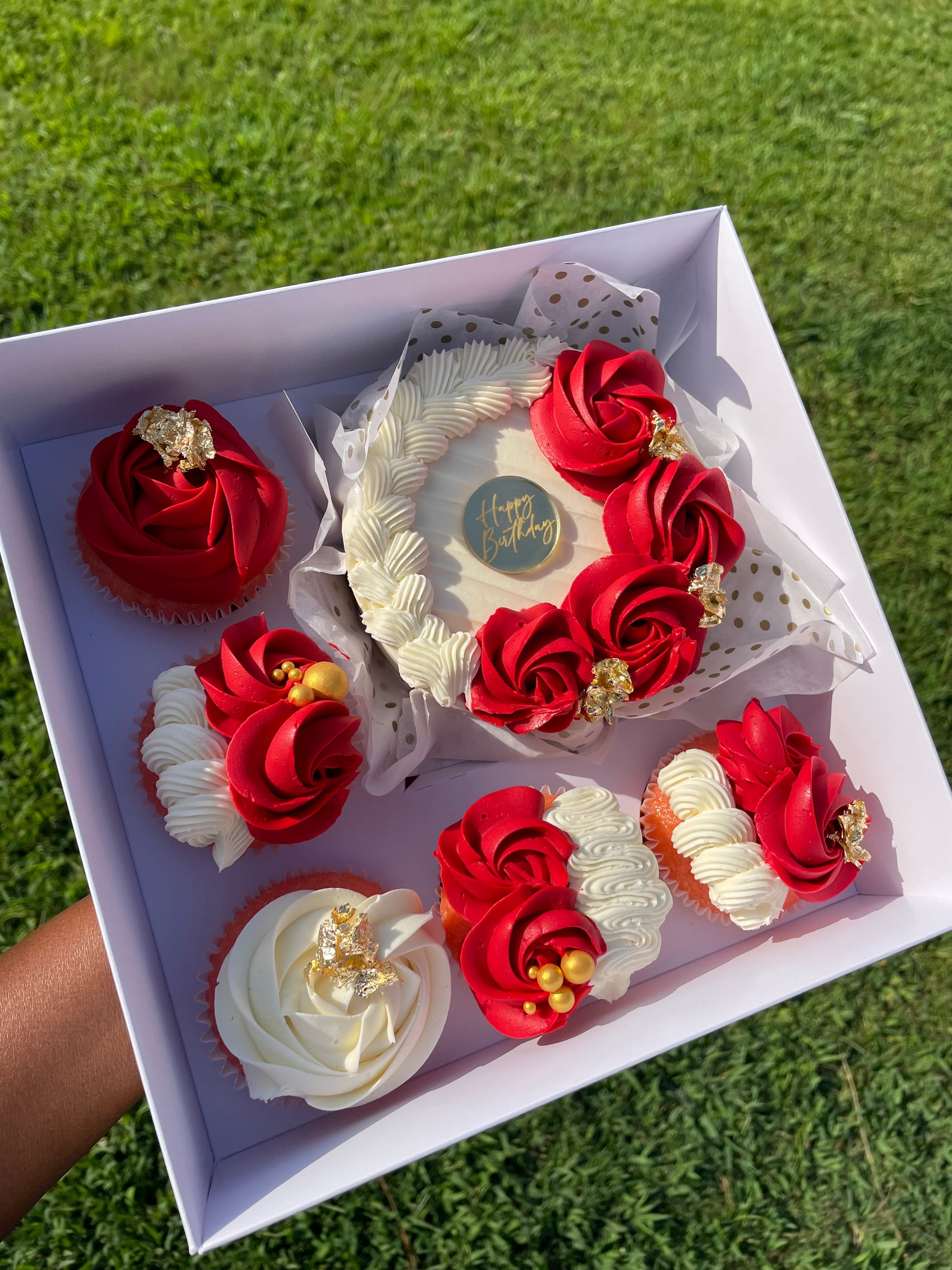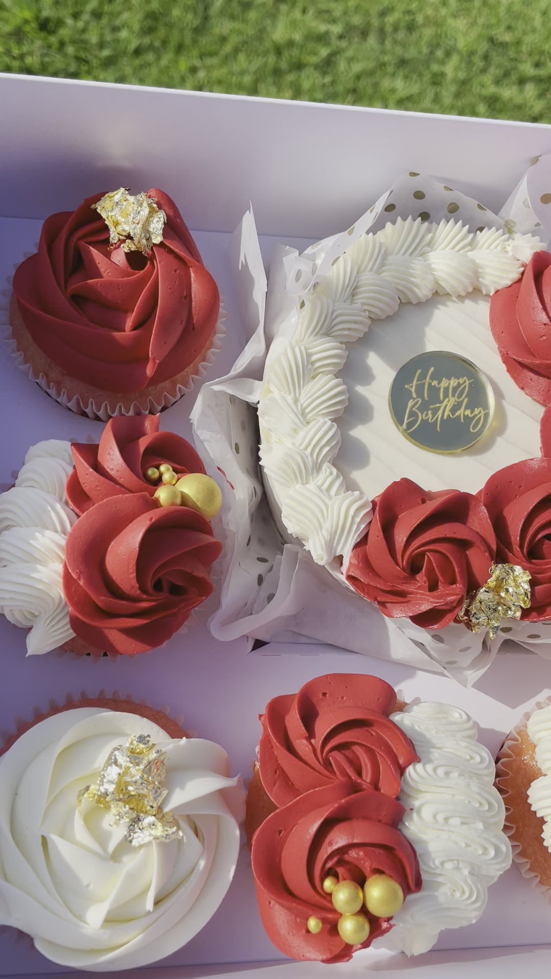 Box includes: Mini 5” Cake and 5 Glam Cupcakes and written message or standard acrylic charm (e.g Happy Birthday, Cheers, Thank You).
